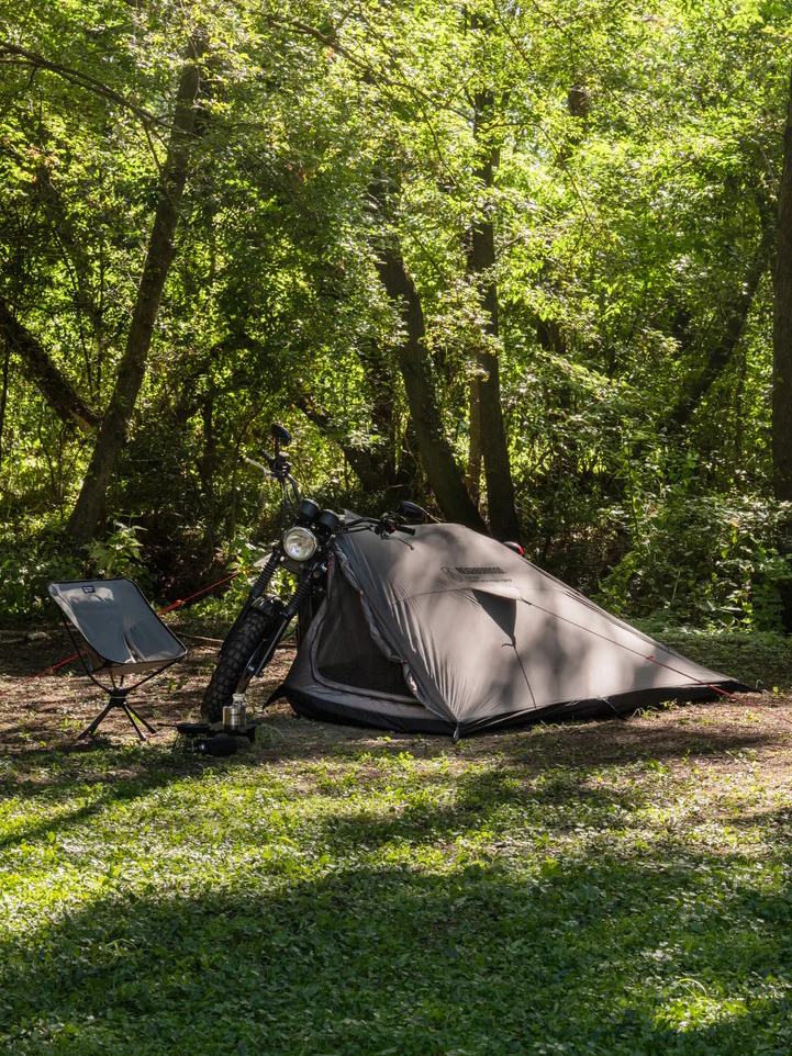 原創無桿自行車帳篷,由摩托車和自行車支撐,為旅行者打造防水防撕裂尼龍帳篷庇護所。