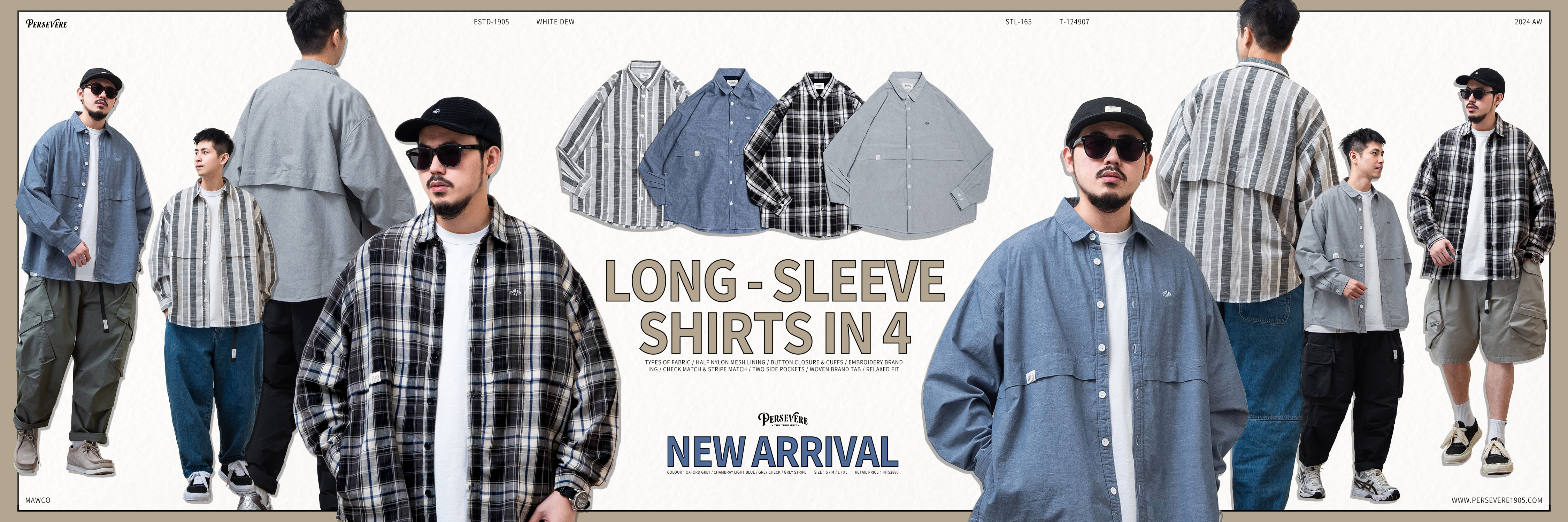 PERSEVERE 秋冬首款寬版外搭式長袖襯衫全新發售,選用四季皆宜的牛津布、青年布、格紋布與條紋布製作,並進行格紋、條紋對線工序,提升整體質感;版型以寬鬆落肩作為設定,並規劃拼接裁片的設計細節,提升著用時的立體感,衣身兩側安排隱藏式手插袋,加強實用機能性,內搭T恤或背心可穿出層次造型感,是一款高搭配性的外搭式單品。