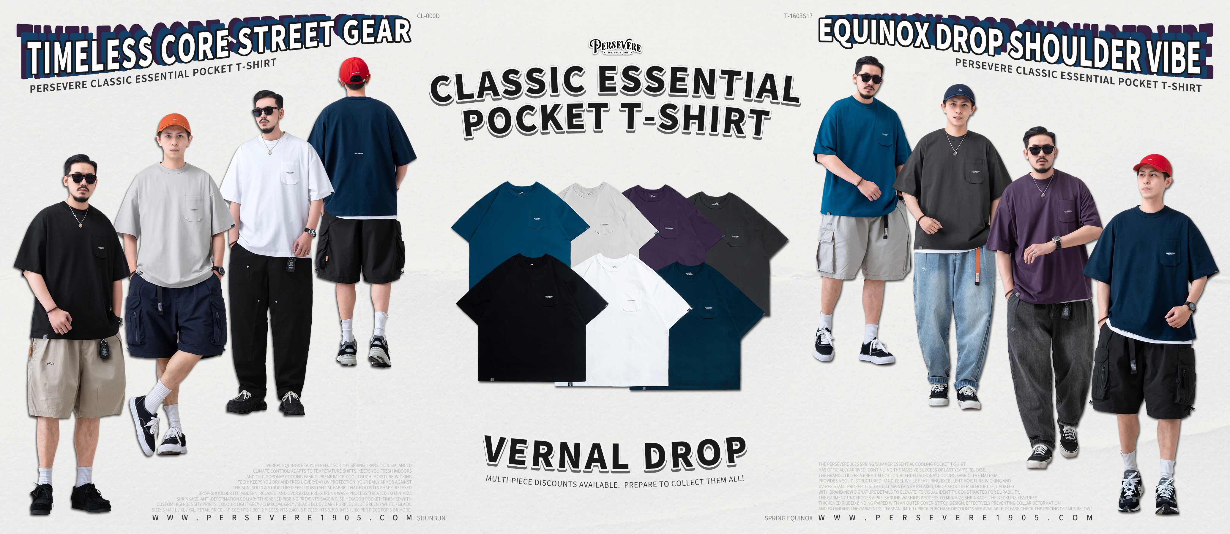 PERSEVERE 2026 春夏必備定番涼感口袋T恤全新發售,延續去年的大受好評,品牌持續採用棉質混紡SORONA®涼感材質製作,面料手感紮實,同時具有吸濕排汗、抗UV的機能特性。版型保持寬鬆落肩的輪廓,並加入全新識別細節,提升整體辨識度。製程工序方面,經水洗預縮處理,有效降低衣物縮率;領口則採用加厚羅紋包覆,搭配外包式車縫固定設計,減少領圍變形問題,進一步提升耐穿性與整體使用壽命。