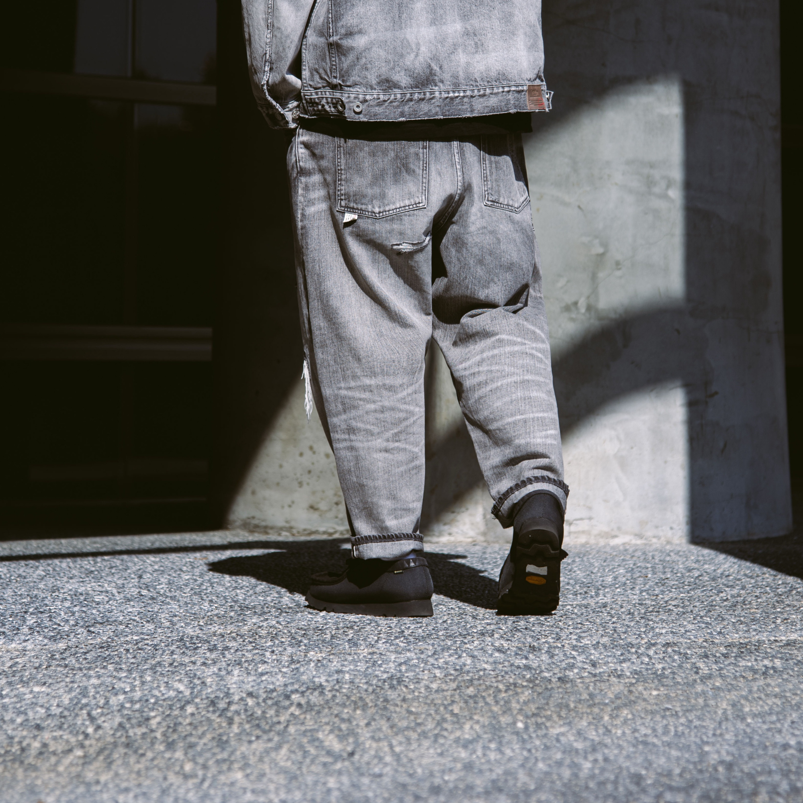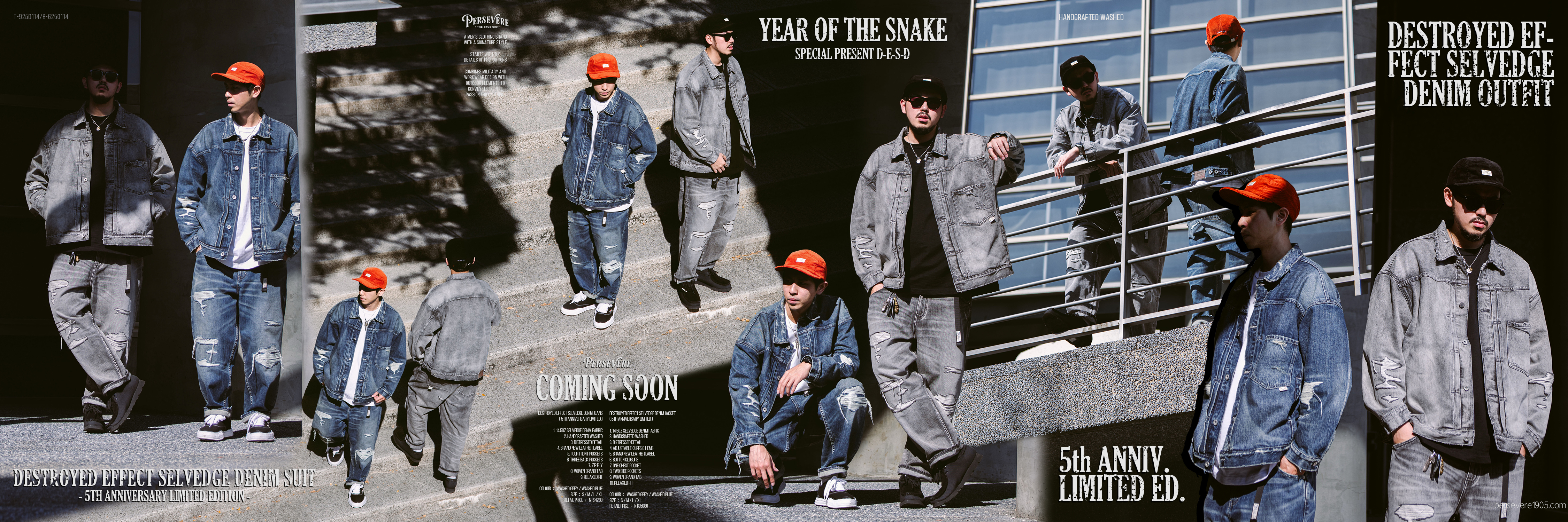 PERSEVERE 品牌五週年限定破壞工藝丹寧套組 - 頂級手工破壞赤耳牛仔褲全新發售,挑選 14.5oz 的重磅丹寧布料製作,並將版型設定為寬鬆立體的錐形輪廓,透過職人師傅們手工製作出刀割、抽鬚、袋邊磨損等破壞處理,搭配刷製的自然貓鬚色落與不對稱刷紋細節,展現高階的工藝質感。