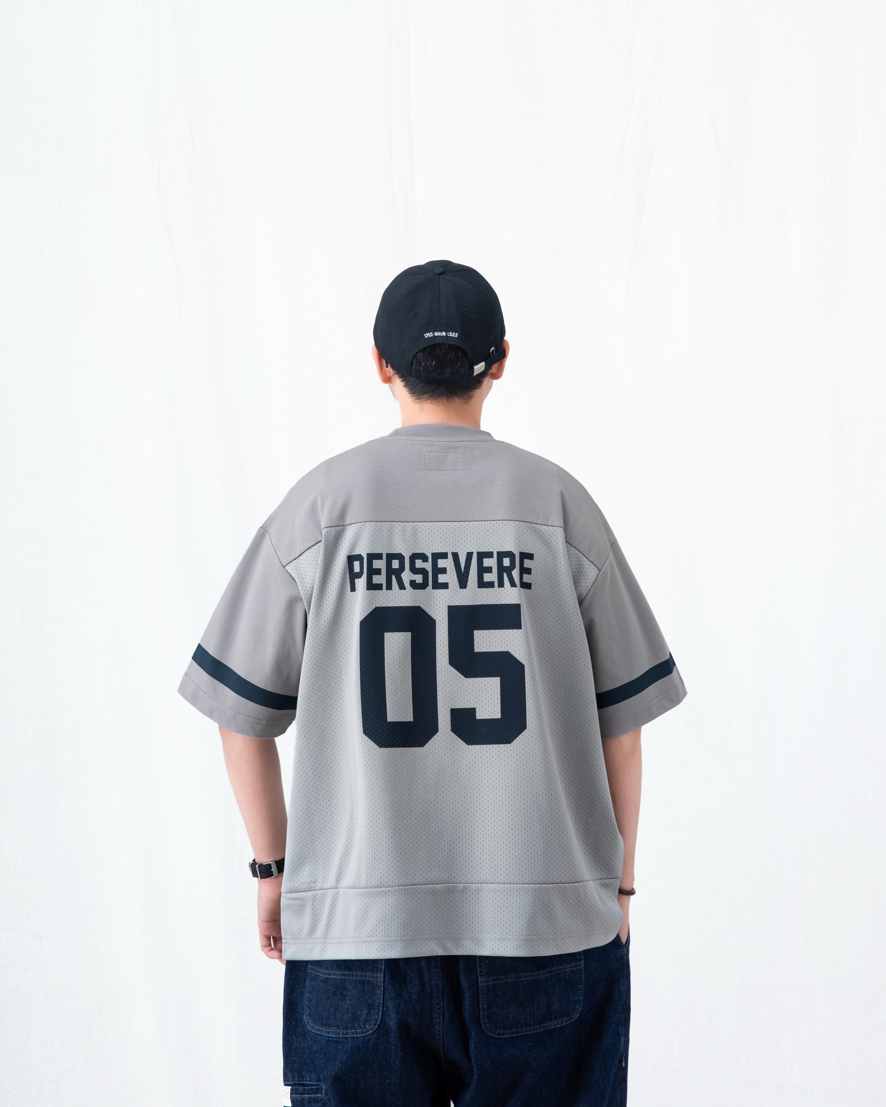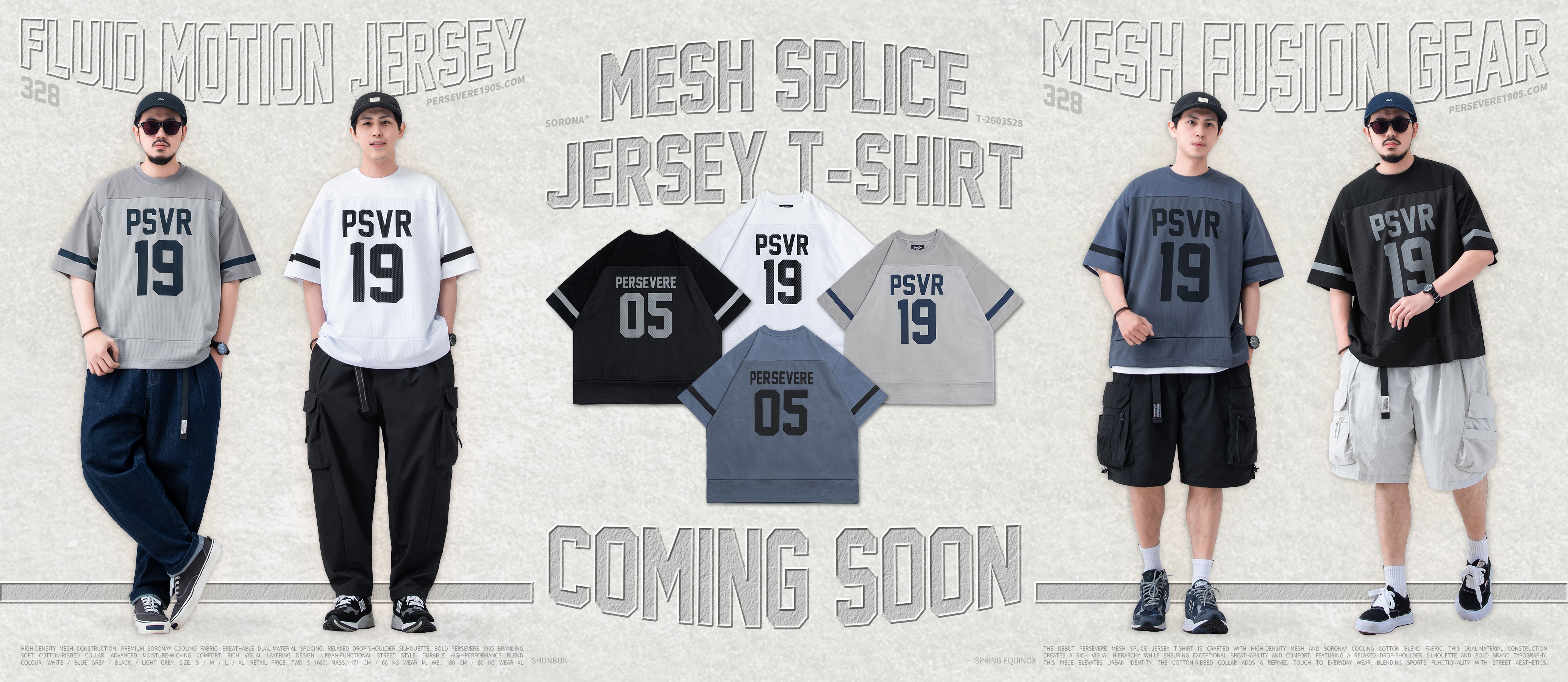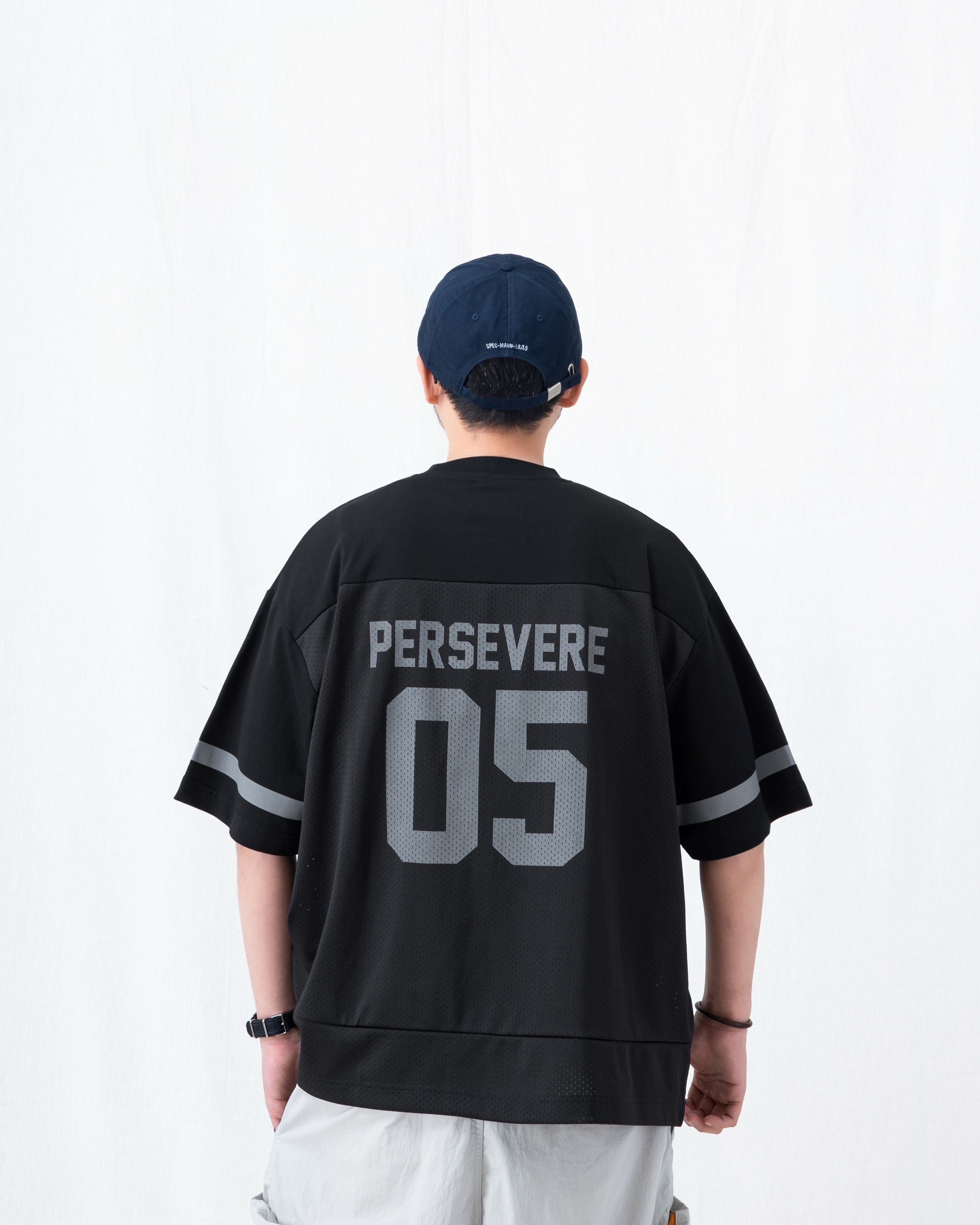 PERSEVERE 首發拼接球衣短袖T恤全新發售,選用高密度網眼材質,拼接SORONA®涼感棉質混紡布料製作,營造豐富的視覺層次,面料兼具透氣與涼爽等機能特性,帶來清爽舒適的穿著體驗。版型以寬鬆落肩為輪廓設定,搭配品牌字樣印刷設計,進一步提升整體辨識度。細節方面,領口採用棉質羅紋設計,增添日常著用時的舒適感。
